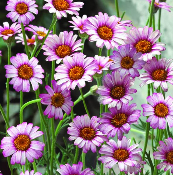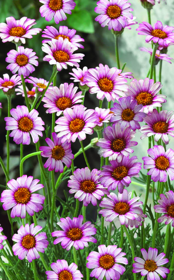A delightful, spreading, low-growing evergreen perennial. Fine silvery leaves are covered in bright pink and white bicolour daisy-like flowers in Summer.