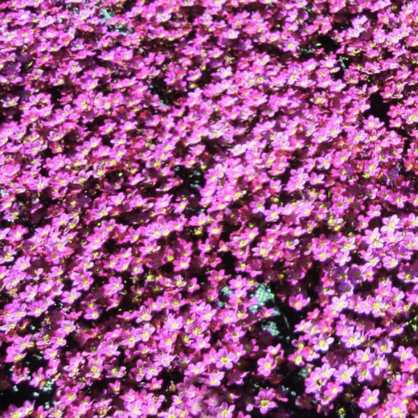 Masses of starry, pink flowers on wiry little stems, above evergreen mounds of fresh green, mossy, spreading foliage.